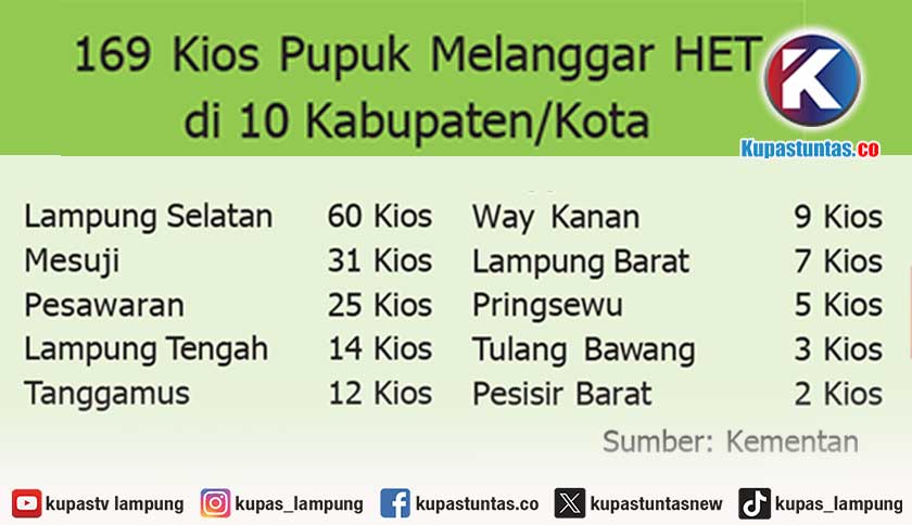 Berdasarkan data dari Kementerian Pertanian (Kementan) yang diterima Kupas Tuntas, sebanyak 169 kios di Lampung menjual pupuk bersubsidi melebihi HET. Kios nakal terbanyak berada di Kabupaten Lampung Selatan (Lamsel) sebanyak 60 kios, dan paling sedikit di Kabupaten Pesisir Barat (Pesibar) dengan dua kios (lihat tabel).