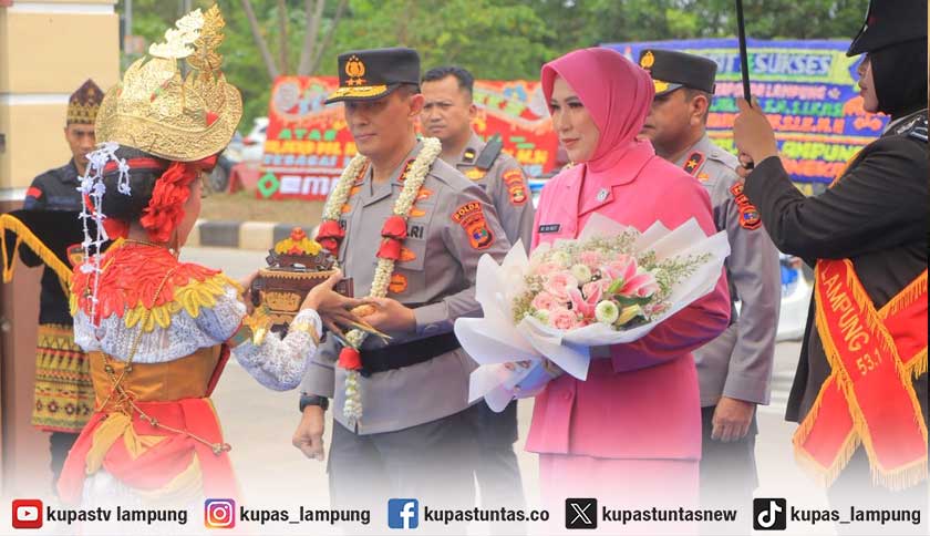Prosesi penyambutan Kapolda Lampung yang baru Irjen Pol Helfi Assegaf dan Istri. Foto: Ist
