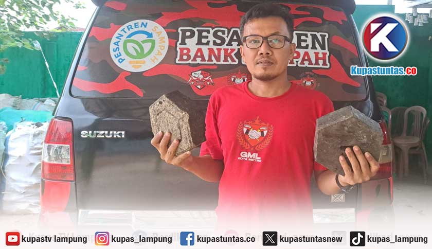 Ketua GML Indonesia, Slamet Riadi saat menunjukkan hasil paving blok berbahan sampah plastik kresek dalam kegiatan pelatihan di Pesantren Sampah Nusantara, Metro Utara. Foto: Arby/Kupastuntas.co