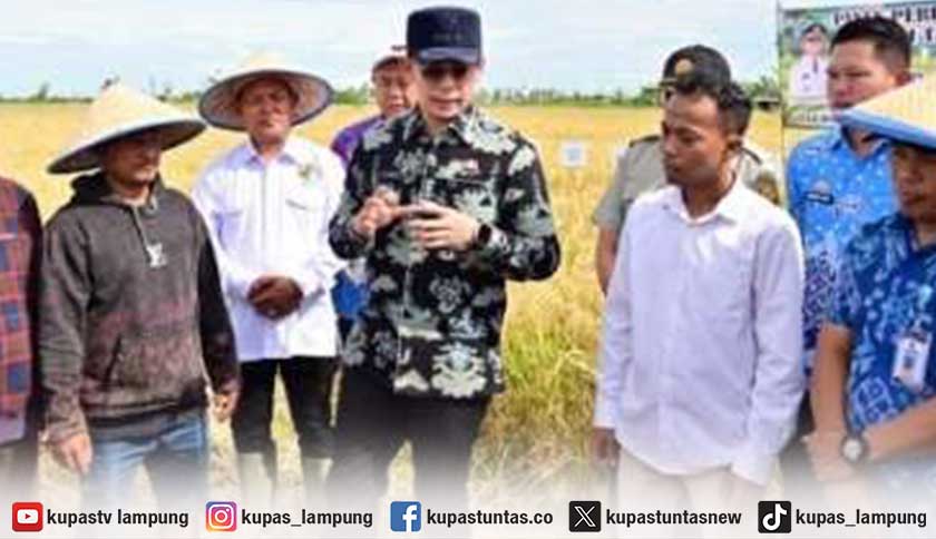 Bupati Lampung Selatan, Radityo Egi Pratama, saat menghadiri panen raya perdana padi biosalin di Desa Bandar Agung, Kecamatan Sragi, Kamis (6/11/2025). Foto: Ist