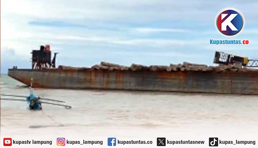 Tongkang Bermuatan Kayu Terdampar di Pantai Tanjung Setia Pesisir Barat