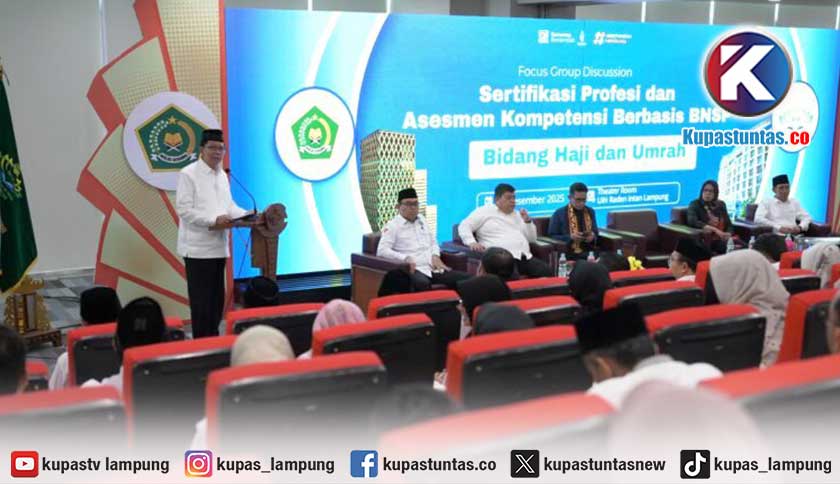 Kupastuntas.co, Bandar Lampung - Universitas Islam Negeri (UIN) Raden Intan Lampung (RIL) menggelar Sosialisasi Sertifikasi Profesi dan Asesmen Kompetensi Berbasis BNSP Bidang Haji dan Umrah. Sosialisasi berlangsung di Ruang Teater lantai 2 Gedung Academic & Research Center, Selasa (09/12/2025).