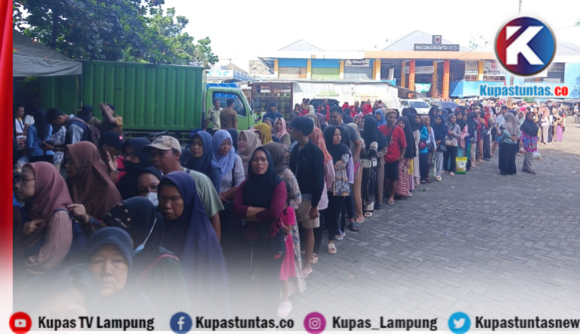 Antrian warga untuk mendapatkan sembako dengan harga murah dalam kegiatan operasi pasar yang digelar di halaman Pasar Cendrawasih, Metro Pusat. Foto: Arby/Kupastuntas.co