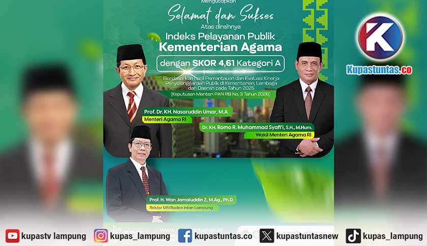Kupastuntas.co, Bandar Lampung - Rektor Universitas Islam Negeri (UIN) Raden Intan Lampung (RIL), Prof. H. Wan Jamaluddin Z., M.Ag., Ph.D., menyampaikan apresiasi atas capaian Kementerian Agama Republik Indonesia yang berhasil meraih Predikat Terbaik Kategori A dengan skor 4,61 pada Indeks Pelayanan Publik Tahun 2025, Senin (12/01/2026).