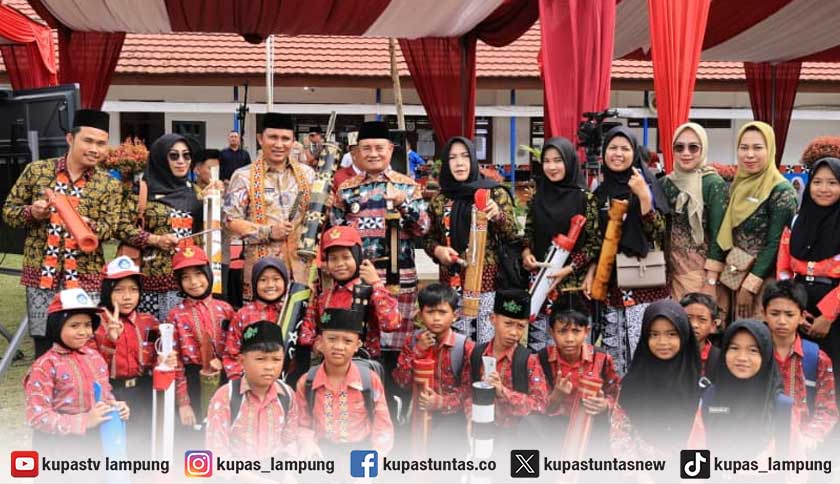 Bupati Lampung Barat, Parosil Mabsus saat foto bersama para pelajar dan tamu undangan saat meluncurkan kekuhan sebagai sistem peringatan dini berbasis kearifan lokal, Kamis (12/2/2026). Foto: Ist