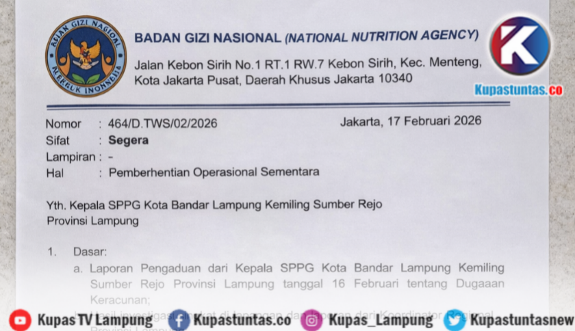 Penegasan tersebut merujuk pada surat resmi BGN Nomor: 464/D.TWS/02/2026 tertanggal 17 Februari 2026 yang bersifat segera, perihal Pemberhentian Operasional Sementara.