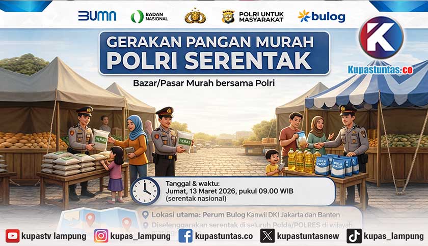 Kupastuntas.co, Bandar Lampung - Kepolisian Republik Indonesia (Polri) akan menggelar Gerakan Pangan Murah Polri Serentak melalui kegiatan bazar atau pasar murah bahan pokok bagi masyarakat pada Jumat, 13 Maret 2026 pukul 09.00 WIB.