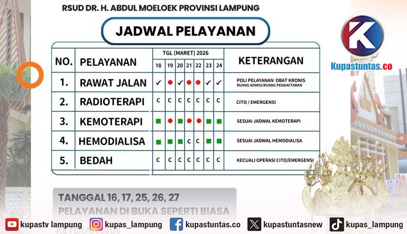 Kupastuntas.co, Bandar Lampung - Menyambut cuti bersama dan libur Hari Raya Idulfitri 2026, RSUD Dr. H. Abdul Moeloek Provinsi Lampung memastikan tetap memberikan pelayanan kesehatan kepada masyarakat. Meski banyak instansi menjalani libur bersama, rumah sakit rujukan utama di Lampung ini tetap beroperasi guna mengakomodasi kebutuhan pelayanan kesehatan masyarakat.