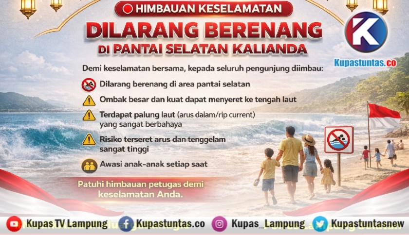 Kupastuntas.co, Lampung Selatan - Libur Lebaran di pesisir selatan Lampung menyimpan ancaman serius. Kepolisian mengeluarkan peringatan tegas kepada wisatawan agar tidak nekat berenang, menyusul tingginya risiko arus balik (rip current) dan gelombang laut yang bisa menyeret korban dalam hitungan detik.