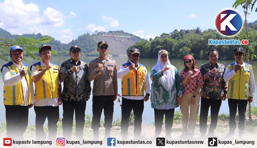 Kapolres Pringsewu AKBP M. Yunnus Saputra bersama rombongan saat meninjau Bendungan Way Sekampung di Pekon Bumi Ratu, Kecamatan Pagelaran. Foto: Manalu/Kupastuntas.co
