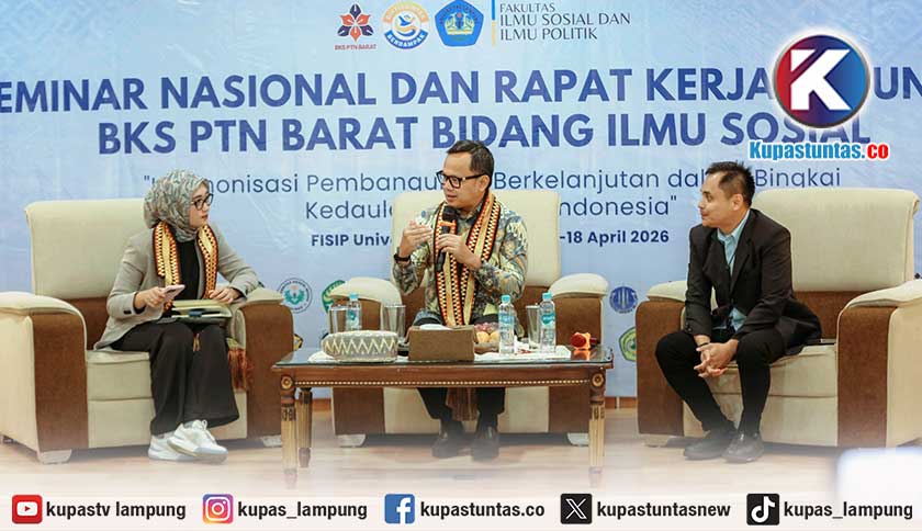 Kupastuntas.co, Bandar Lampung - Wakil Gubernur Lampung, Jihan Nurlela, menjadi narasumber dalam Seminar Nasional Badan Kerja Sama Perguruan Tinggi Negeri (BKS PTN) Barat Bidang Ilmu Sosial yang digelar di Fakultas Ilmu Sosial dan Ilmu Politik (FISIP) Universitas Lampung, Jumat (17/4/2026).