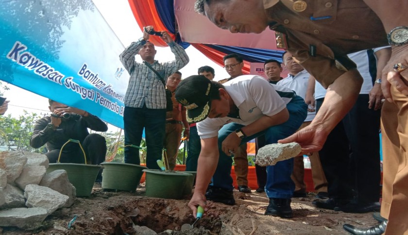Wali kota Bandar Lampung Herman HN meletakkan batu pertama sarana dan prasarana kawasan konservasi sungai Permata Biru Sukarame, Selasa (17/12/2019). Foto: Sri