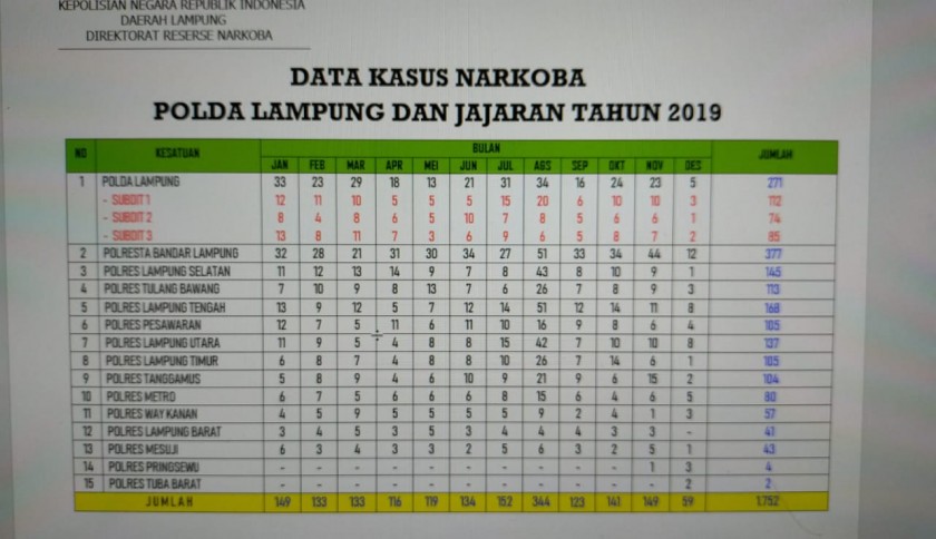 Dia merinci, kasus penyalahgunaan narkoba tertinggi di wilayah hukum Polresta Bandar Lampung dengan jumlah kasus 377 dengan 579 tersangka. Kemudian disusul Polda Lampung dengan jumlah 271 kasus dan 342 tersangka. Polres Lampung Tengah sebanyak 168 kasus dan 220 tersangka.