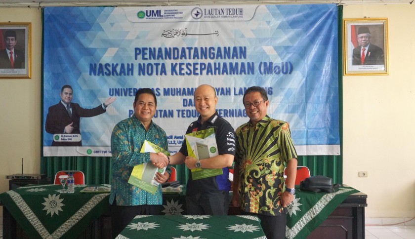 Bandar Lampung- Rektor Universitas Muhammadiyah Lampung (UML) Dalman, dan Gwesley Griemaldy Kussoy selaku GM PT. Lautan Teduh Interniaga menandatangani nota kesepahaman (MoU) antara UML dan PT. Lautan Teduh Interniaga, Sabtu (28/12/2019).