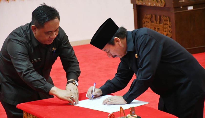 Penandatangan dua Raperda oleh Wali Kota Bandar Lampung Herman HN dalam sidang paripurna di Gedung DPRD Kota Bandar Lampung, Selasa (28/01/2020). Foto: Sulaiman