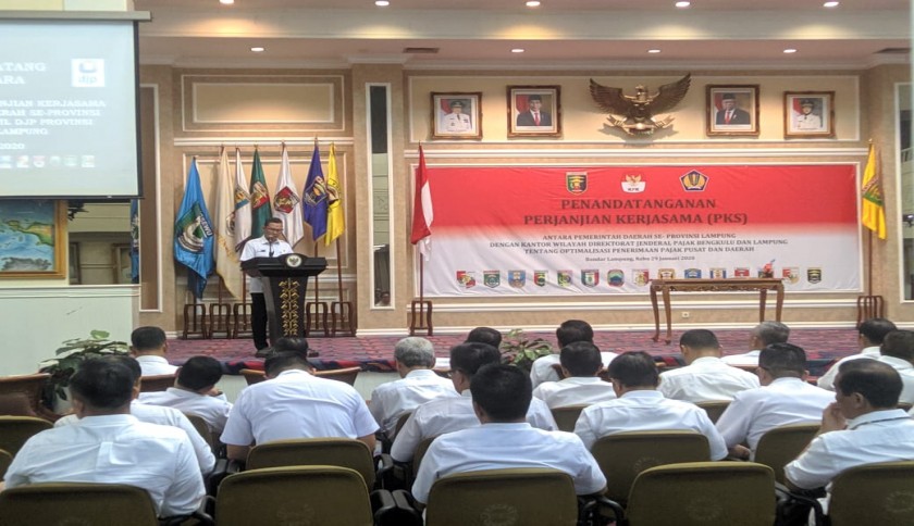 Bandar Lampung-Sekretaris Daerah Provinsi Lampung, Fahrizal Darminto menandatangani Perjanjian Kerja Sama (PKS) dengan Kanwil Direktorat Jenderal Pajak (DJP) Bengkulu dan Lampung terkait optimalisasi penerimaan pajak pusat dan daerah di Balai Keratun Perkantoran Gubernur Lampung, Rabu (29/1/2020).