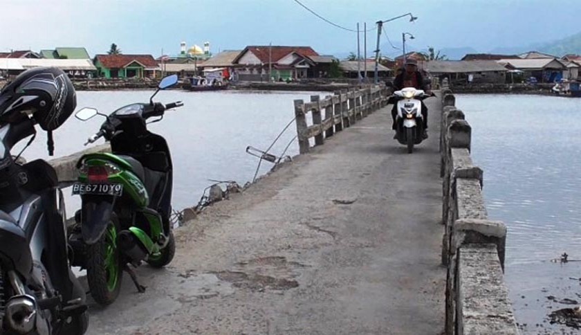 Pengendara sepeda motor saat melewati jembatan yang merupakan akses tunggal ke Pulau Pasaran, Bandar Lampung. Foto: Sri