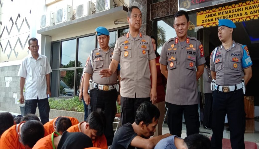 Kapolresta Bandar Lampung Kombes Pol Yan Budi Jaya melihat para tersangka saat dihadirkan dalam ekspos di Mapolresta setempat, Selasa (4/2/2020). Foto: Oscar/kupastuntas.co
