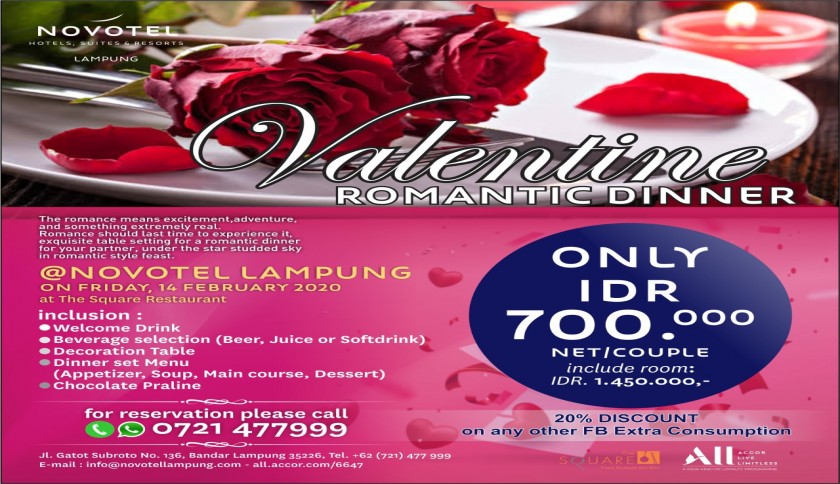 Penawaran promo untuk pengunjung Novotel Lampung antara lain Romantic Dinner dengan hanya Rp 700.000 nett. Selain itu, ada Valentine dinner include room Rp. 1.450.000 nett.