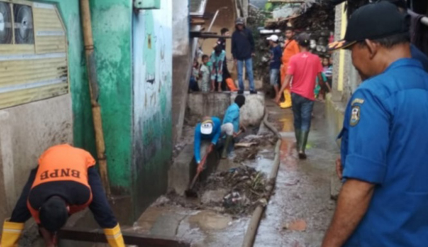 BPBD Kota Bandar Lampung membersihkan lumpur sisa banjir di Pesawahan, Kamis (13/2/2020). Foto: Ist