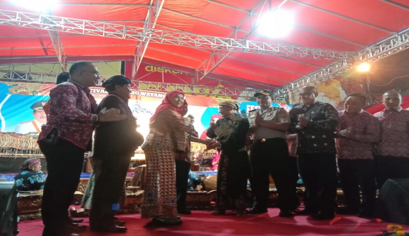 Eva Dwiana menyerahkan wayang kepada salah satu dalang sebagai tanda resminya acara festival dalang wayang kulit dibuka, Rabu (19/2/2020) malam.Foto:Sri