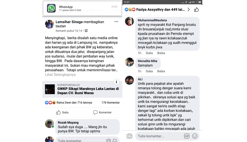 Hal serupa juga disampaikan akun Facebook bernama MuhammadMaulana. "Sepertinya msyarakt Kot Panjang brsatu dn brsuara (unjuk rasa), minta solusi kepada perusahaan dan Pemda stempat yang jalan rayany rawan kecelakaan, tuk mencegah kecelakaan yang sudah merenggut banyk korban jiwa," tulisnya.