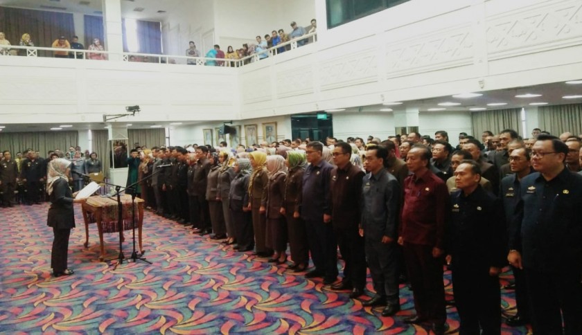 Wakil Gubernur Lampung Chusnunia Chalim melantik dan mengambil sumpah jabatan 217 Pejabat Administrator (Eselon III) di Lingkungan Pemerintah Provinsi Lampung, di Balai Keratun Lt 3, Komplek Kantor Gubernur Lampung, Jumat (28/2/2020). Foto: Siti/Kupas Tuntas