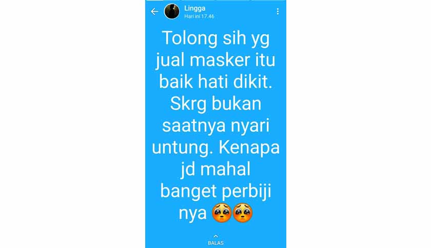 story whatsapp Lingga mengeluhkan langkanya barang dan melambungnya harga masker di pasaran.