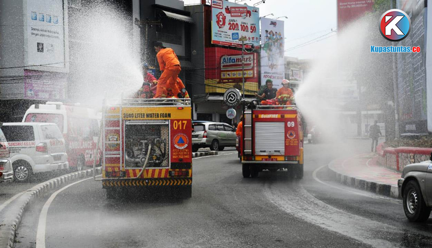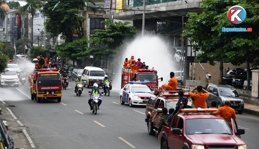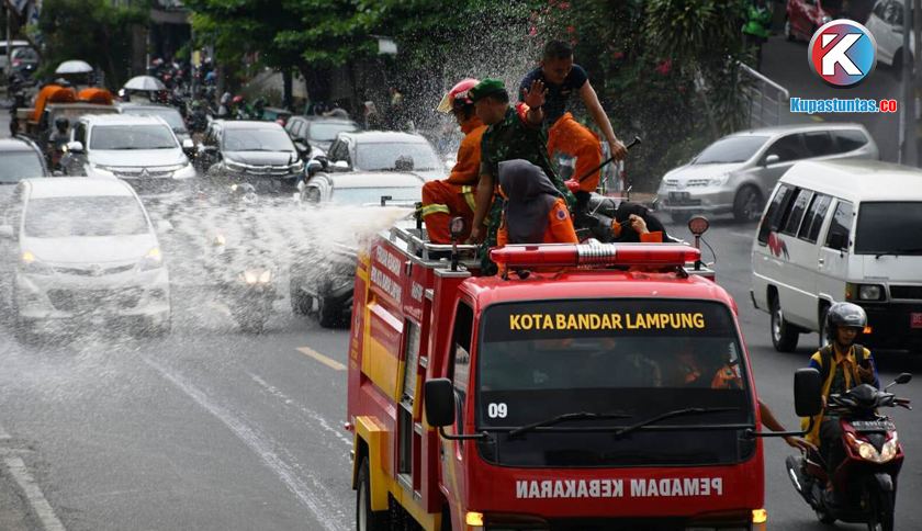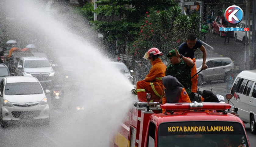 Penyemprotan Disinfektan sepanjang Jalan Protokol Bandar Lampung, Senin (23/03/2020). Foto: Sulaiman/Kupastuntas.co