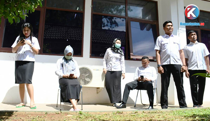 Terlihat beberpa pegawai Protokol dan Informasi Pimpinan Pemkot Bandar Lampung yang secara bergantian berjemur di pelantaran kantor, Rabu (01/04/2020). Foto: Sulaiman/Kupastuntas.co