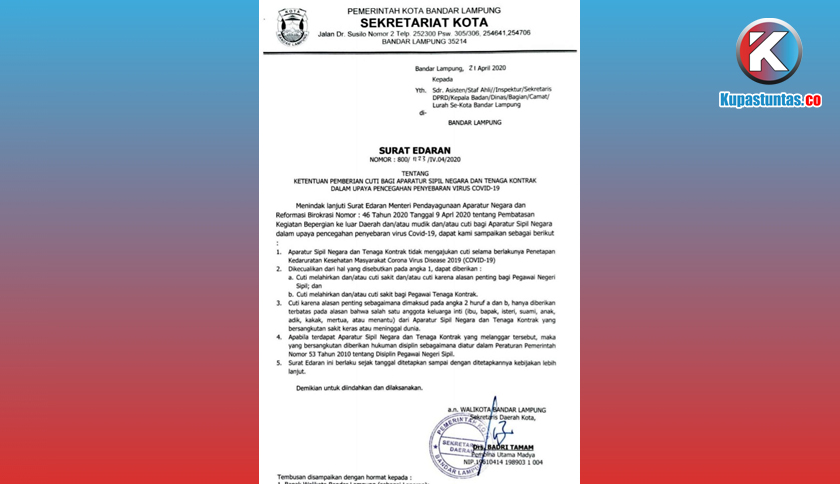 SE tersebut langsung ditanda-tangani oleh Walikota Bandar Lampung, Herman HN, nomor 800/ 123 /IV.04/2020 tentang ketentuan pemberian cuti bagi ASN dan tenaga kontrak.