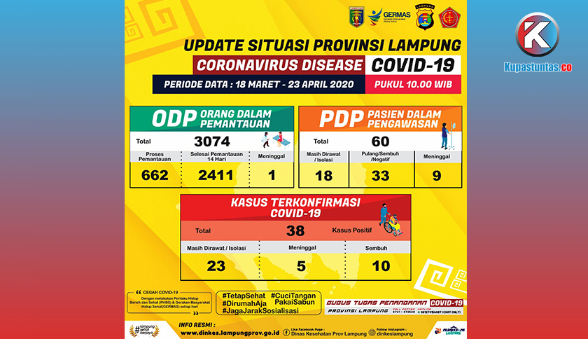 Bandar Lampung - Pemerintah Provinsi Lampung melalui Dinas Kesehatan Provinsi Lampung kembali merilis data perkembangan Coronavirus disease (Covid - 19) di bumi tapis berseri, Kamis (23/04/2020).
