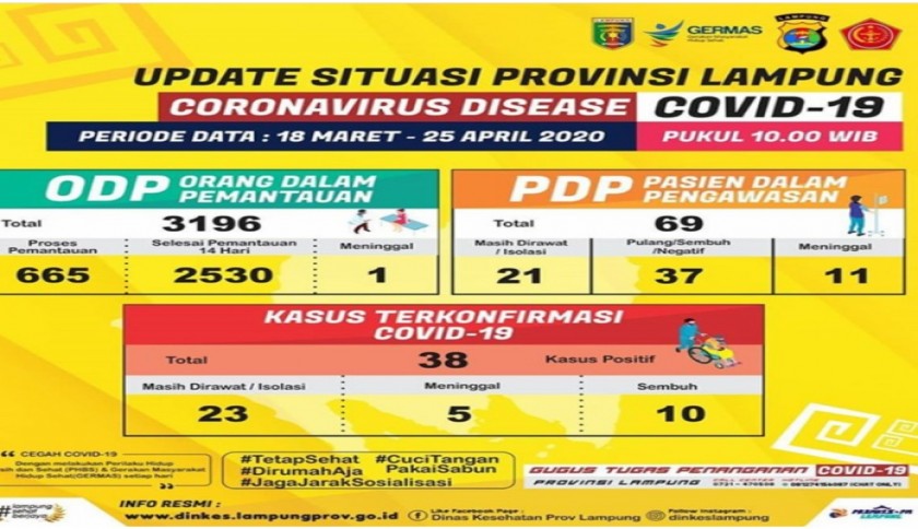 Bandar Lampung - Pemerintah Provinsi Lampung melalui Dinas Kesehatan Provinsi Lampung kembali merilis data perkembangan Coronavirus disease (Covid - 19) di bumi tapis berseri, Sabtu (25/4/2020).