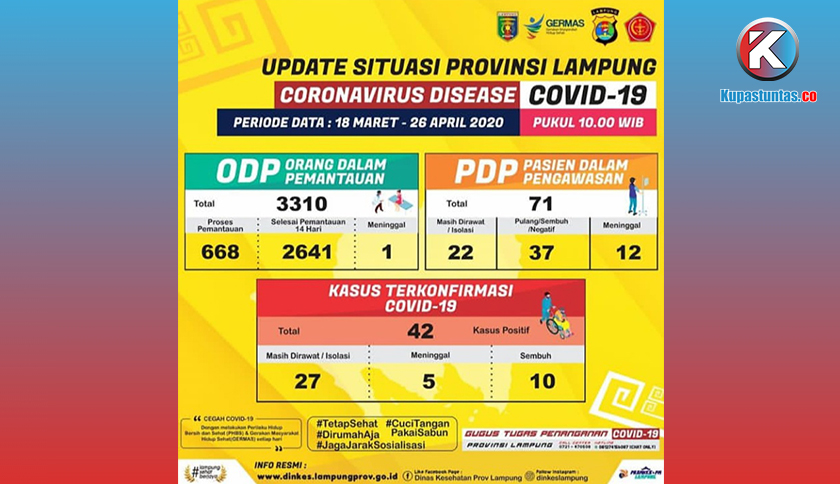 Bandar Lampung - Pemerintah Provinsi Lampung melalui Dinas Kesehatan (Dinkes) Provinsi Lampung kembali merilis data Update Covid-19 di bumi tapis berseri, Minggu (26/04/2020).