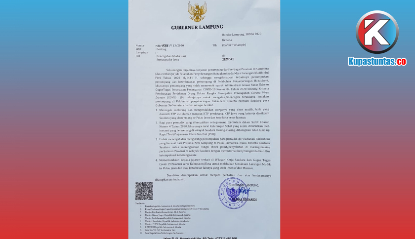 Untuk mencegah dan mengurangi penumpukan para pemudik di Pelabuhan Bakauheni yang berasal dari Provinsi Non Lampung di Pulau Sumatera, maka diminta bantuan Saudara untuk meningkatkan fungsi check point/penyekatan di masing-masing perbatasan Provinsi di wilayah Saudara dengan memutar balikan/mengembalikan Bus ketempat asal keberangkatan.