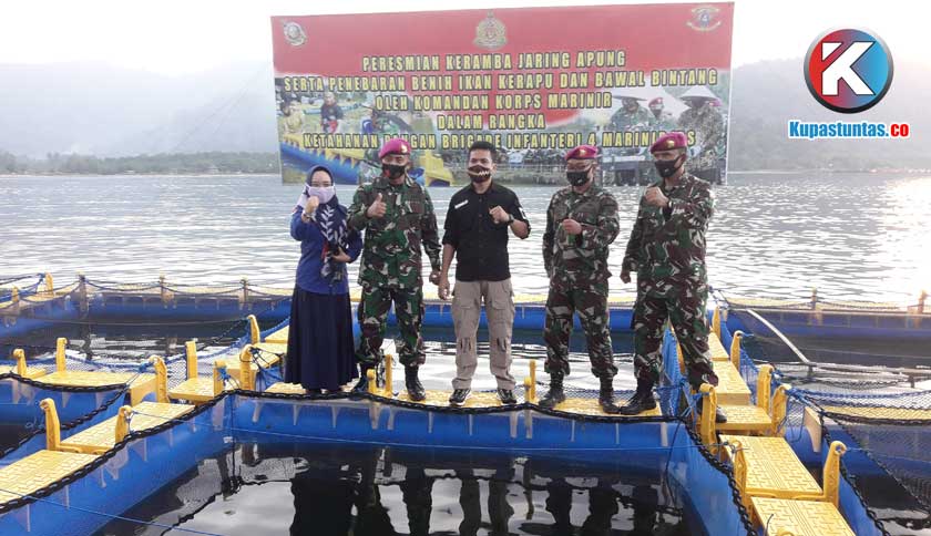 Komandan Brigif 4 Marinir/BS Kolonel Marinir Nawawi bersama Dirut Kupas Tuntas Donald Harris Sihotang foto bersama di atas kerambah jaring apung milik Brigif 4 Marinir. Foto: Tampan/Kupastuntas.co