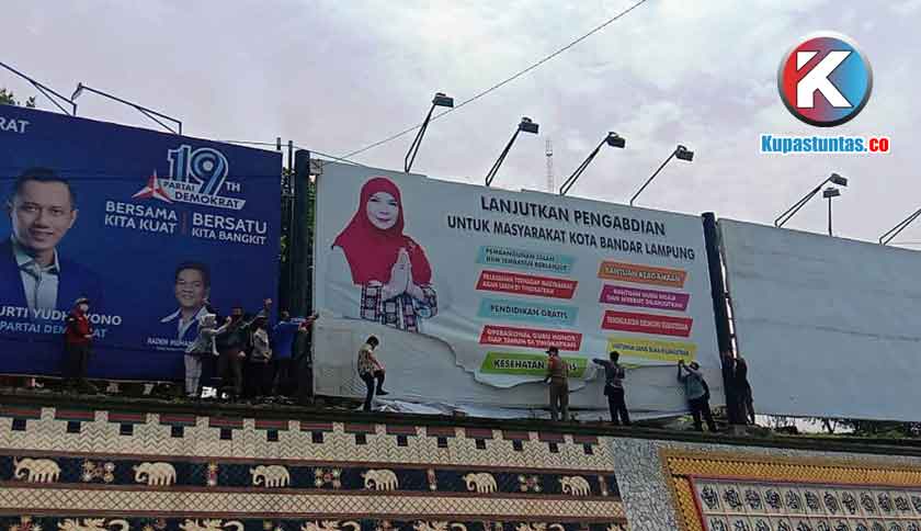 Bandar Lampung, kupastuntas.co - Badan Pengawas Pemilu (Bawaslu) dan Satuan Polisi Pamong Praja (Sat Pol PP) Bandar Lampung melakukan penertiban dan mencopot paksa Alat Peraga Kampanye (APK) calon yang masih bertebaran di sepanjang jalan Protokol setempat, Jumat (25/09/2020).