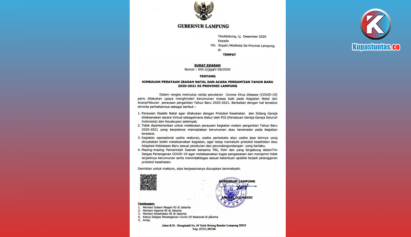 Bandar Lampung, Kupastuntas.co - Gubernur Lampung Arinal Djunaidi mengeluarkan Surat Edaran (SE) dengan nomor 045.2/3921/V.06/2020 tentang Imbauan Perayaan Ibadah Natal dan Acara Pergantian Tahun Baru 2020-2021 di Provinsi Lampung yang ditunjukkan kepada seluruh Bupati/Walikota di Lampung.
