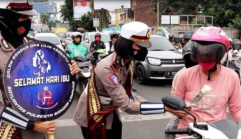 Peringati Hari Ibu, Polresta Bandar Lampung Bagikan Mawar dan Masker di Tugu Adipura