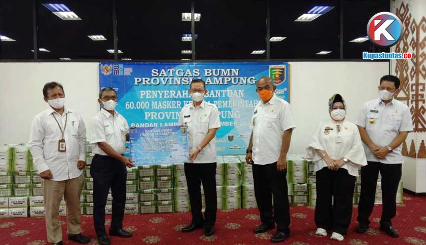 Bandar Lampung, Kupastuntas.co - Satuan Tugas (Satgas) Badan Usaha Milik Negara (BUMN) Lampung menyerahkan sebanyak 60 ribu masker kain kepada Pemerintah Provinsi (Pemprov) Lampung untuk selanjutnya dibagikan kepada masyarakat.