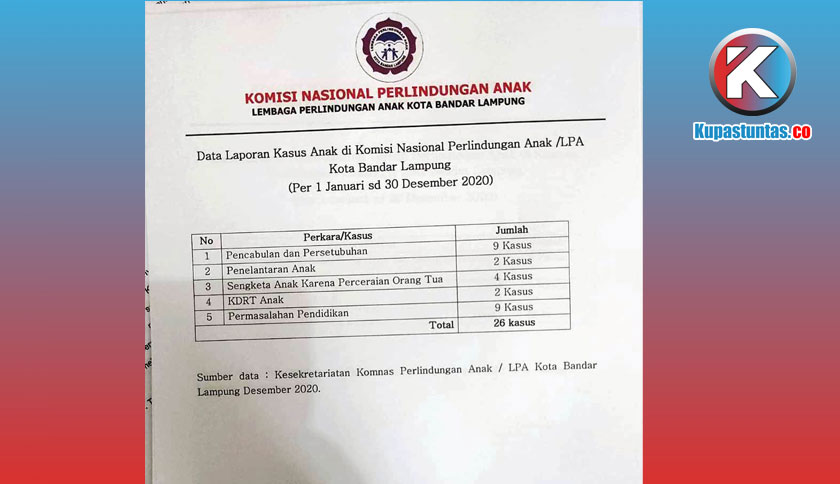data laporan kasus anak di Komisi Nasional Perlindungan Anak/LPA Kota Bandar Lampung sepanjang tahun 2020.