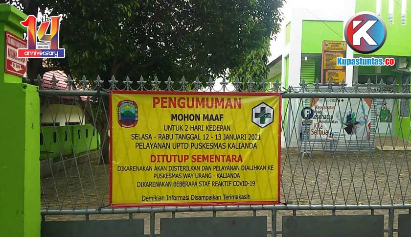 Berdasarkan banner yang dipasang di pagar UPTD Puskesmas Kalianda, tertulis pelayanan kesehatan ditutup sementara mulai tanggal 12-13 Januari 2021, pelayanan dialihkan ke Puskesmas Way Urang.