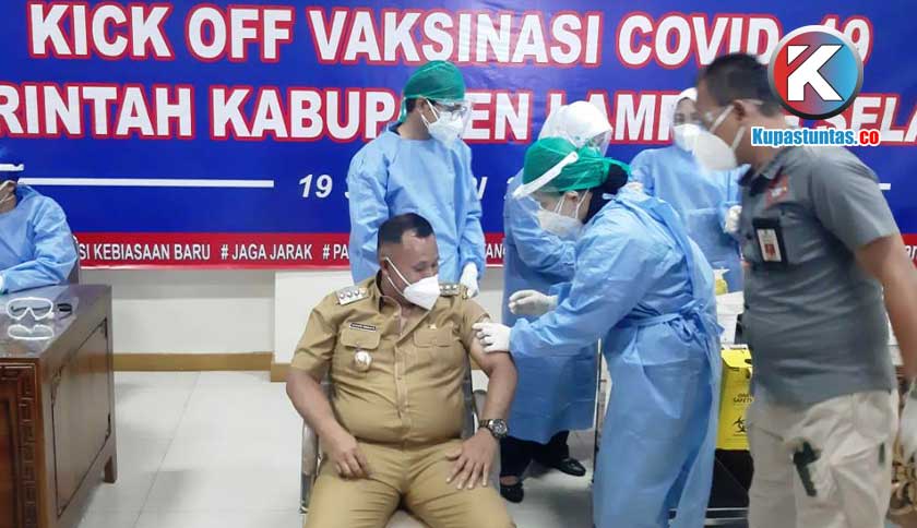 Lampung Selatan, Kupastuntas.co - Kabupaten Lampung Selatan (Lamsel) menggelar vaksinasi Covid-19 tahap pertama di Rumah Sakit Umum Daerah (RSUD) Bob Bazar SKM Kalianda, Selasa (19/01/2021). Bupati Nanang Ermanto menjadi orang pertama di Kabupaten setempat yang divaksin Covid-19.