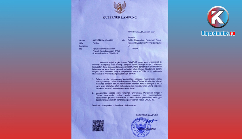 Kupastuntas.co, Bandar Lampung - Pemerintah Provinsi (Pemprov) Lampung memberikan imbauan kepada seluruh Universitas di Lampung untuk menunda sementara pelaksanaan kegiatan lapangan secara tatap muka bagi mahasiswa ditengah pandemi Covid-19.