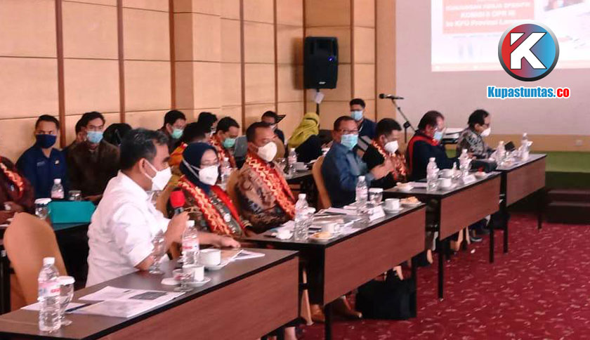 Anggota Komisi II DPR RI Ahmad Muzanni (Baju Putih) saat menyampaikan evaluasi kepada Bawaslu Lampung di Hotel Bukit Randu, Rabu (3/2/2021). Foto: Sule/Kupastuntas.co