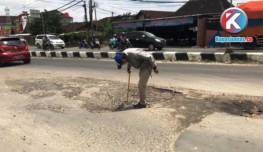 Tim dari Dinas Bina Marga dan Bina Kontruksi (BMBK) Provinsi Lampung melakukan pengukuran di titik-titik jalan Ryacudu yang rusak. Foto : Ria/Kupastuntas.co