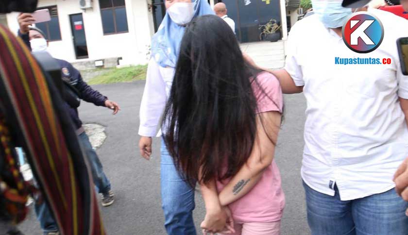 Caca mantan istri Andika Kangen Band yang mengenakan kaos warna pink, hanya tertunduk saat digiring petugas. Foto : Oscar/Kupastuntas.co