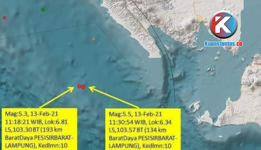 Kupastuntas.co, Bandar Lampung - Dua gempa bumi tektonik pada Sabtu (13/2/2021) dengan skala magnitudo M5,3 dan M5,5 di Lampung tidak berpotensi tsunami.