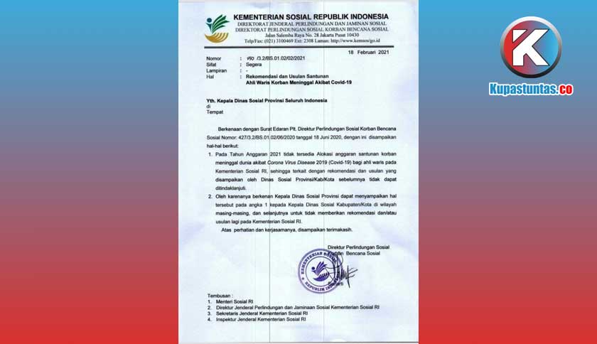 "Pada tahun anggaran 2021 tidak tersedia alokasi anggaran santunan korban meninggal dunia akibat Covid-19 bagi ahli waris pada Kemensos RI, sehingga terkait dengan rekomendasi dan usulan yang disampaikan oleh Dinsos Provinsi/Kab/Kota sebelumnya tidak dapat ditindaklanjuti," demikian bunyi point 1 surat tersebut, dikutip, Selasa (22/02/2021).