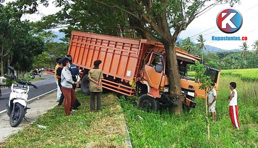 Truk Fuso yang terjun ke sawah lalu menabrak pohon di Jalan Lintas Sumatera Desa Kedaton, Kecamatan Kalianda, Lampung Selatan, Rabu (24/02/2021). Foto: Imanuel/Kupastuntas.co
